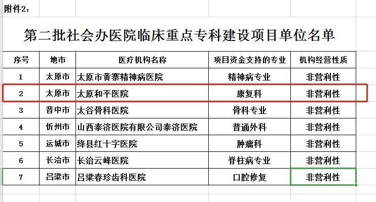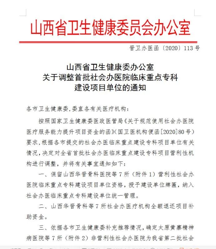 为提高我省医学科学创新能力和疾病综合治疗水平,促进医疗卫生事业可持续发展,支持社会办医院重点特色科室发展,山西省卫健委重新调整社会办医院临床重点专科建设项目的申报和评审工作,经过各医疗机构申报、参考专家团评审后,山西省卫生健康委员会办公室公布了“关于调整首批社会办医院临床重点专科建设项目单位通知”。